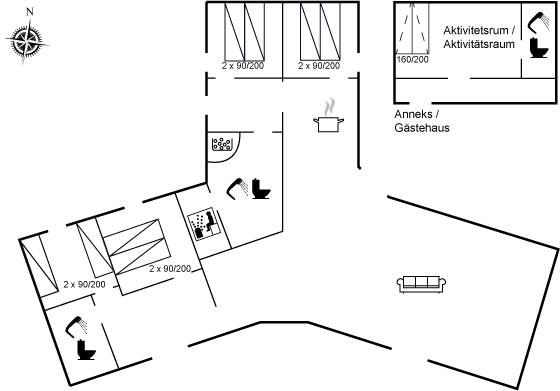 Er I på jagt efter det store, lyse sommerhus, hvor I kan samles flere generationer eller måske flere familier sammen – og hvor der er luft og plads til alle? I dette arkitekttegnede sommerhus fra 2014 på 202 kvadratmeter finder I en gennemtænkt indretning, der rummer et stort fællesområde og tre separate soveafdelinger med plads til i alt 18 sovende gæster, 10 i de 5 soverum, 8 på de 2 hemse (4 boksmadrasser og 4 kraftige skummadrasser. Hver hems er med gulvareal på ca 20 kvm. og god højde til kip (190 cm).