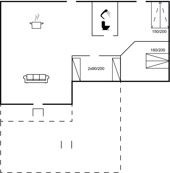 Det åbne køkken ligger i forbindelse med stuen, så du kan lave mad og samtidig være en del af fællesskabet. Stuen er hyggeligt indrettet med en brændeovn, TV og internet med Google TV, så I kan streame jeres yndlingsprogrammer. Der er desuden en dobbelt sovesofa i entreen, som også har god plads til overtøj og fodtøj.