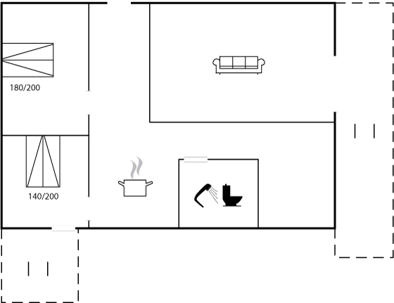 Fra køkkenet og soveværelserne leder endnu en lille trappe jer videre til et lækkert opholdsrum med spiseplads, TV-område og direkte udgang til terrassen. Huset råder desuden over to hemse: én ved opholdsrummet og én med ekstra god loftshøjde og nem adgang via en god trappe. Dermed får I i alt to soveværelser og to hemse – hver med to sovepladser, hvoraf den ene hems har opredning til to personer. Der er med andre ord god plads til både familie og gæster.