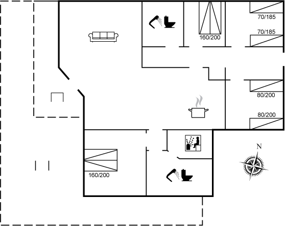 Det store køkkenalrum, som ligger i åben forbindelse med stuen og hvorfra der er udgang til den delvist overdækkede terrasse, er det naturlige samlingssted, når det gælder hygge og samvær. Der er gode 4 soveværelser med hver 2 sovepladser. I det ene soveværelse er der 2 enkeltsenge, som på grund af sengemålene på 70x185 cm., er bedst egnede til børn og unge. Der er 2 badeværelser med bruseniche og gulvvarme. Der findes sauna og vaskemaskine.
