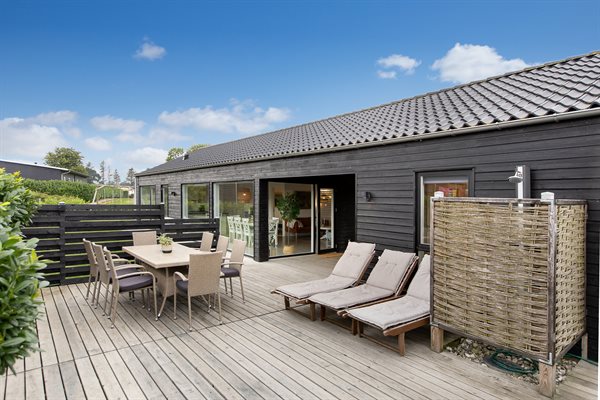 Sommerhus beliggende på havegrund med stor åben og overdækket terrasse, hvor solen og de lune aftene...
