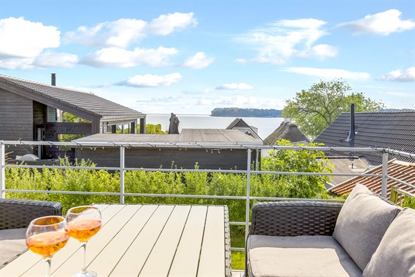 Med dette sommerhus får I en dejlig udsigt til vandet, som kan nydes både fra stuen og den store ter...