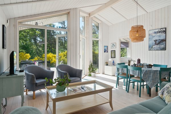 Dette helårsisolerede sommerhus med udendørs spabad fremstår i lys, skandinavisk stil med moderne mø...