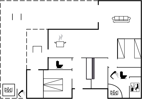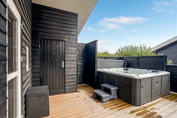 Der er en lille hyggelig morgenterrasse mod øst samt en stor solorienteret terrasse mod syd/vest. Terrassen er møbleret med spisebord, sofagruppe og solsenge. Der er tillige udebruser samt lækkert spabad med plads til 6 personer.