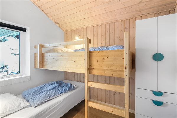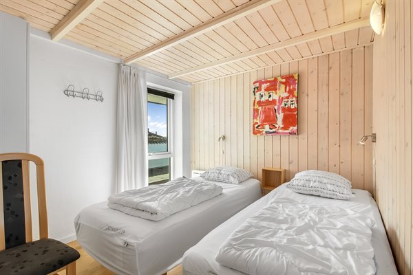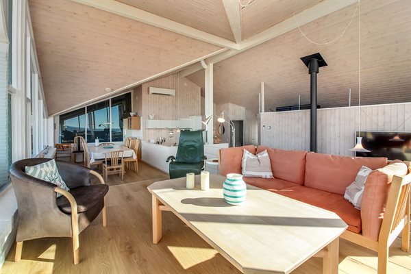 Stuen er i forskudt plan med en flot udsigt. Der er installeret automatisk udluftning, som sikrer et bedre og mere allergivenligt indeklima. Sommerhuset har en stor terrasse med en åben og en overdækket del, så selv hen under aftenen kan man sidde ude og nyde sin ferie.