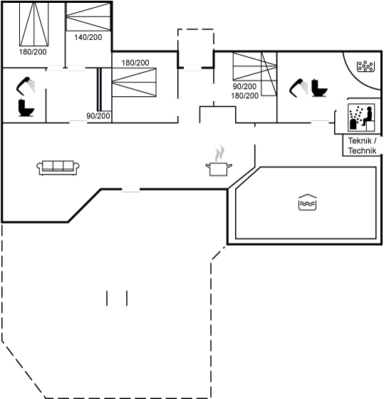 Indenfor byder sommerhuset på et imponerende opholdsrum, der giver plads til hyggelige stunder og samvær med familie og venner. Der er desuden gulvvarme i alle klinkegulv, inklusiv i pool-området.