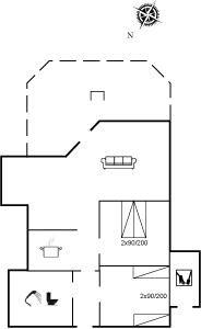 Husets sovepladser fordeler sig på 1 soveværelse med dobbeltseng og 1 værelse med 2 enkeltsenge. Endvidere hems med 2 sovepladser. Der er installeret trådløs internetforbindelse. Barneseng, høj barnestol, gynge og sandkasse til de små feriegæster.