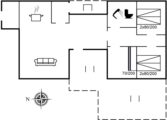 Indenfor er sommerhuset smukt og stilfuldt indrettet med en afslappende sommerhusvibe. Sommerhusets køkken er velindrettet, og her er der plads til, at flere kan hjælpes ad og hygge sig sammen om madlavningen. Fra køkkenet er der åbent til sommerhusets hyggelige stue med den store sofa, hvor I kan slappe af med en god bog eller se en film. I spiseafdelingen kan I tænde op i brændeovnen, og nyde de store gulv til loft vinduer, der giver fornemmelsen af at sidde midt ude i naturen.