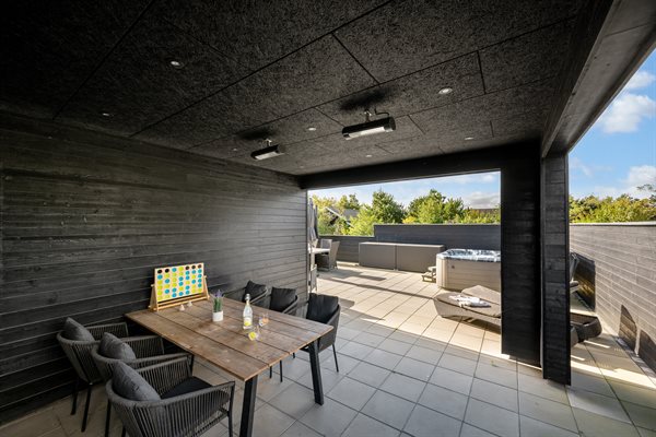 Til ferieboligen hører 100 m² åbent flisebelagt terrasseareal delvis omgivet med stakit for læ og indblik i 2 højder, oplyst med led lys, og til huset hører også et dejligt overdækket 22 m² terrasseareal med indbyggede elektriske terrassevarmer. Der er 1 stort havebord lavet i stål og granit hvor der er plads til 12 personer samt 1 havebord med plads til 6 personer samt 2 solsenge og desuden 2 lounge stole. 3 parasoller er placeret ligeledes på terrassen. På den store terrasse er der desuden en 6 personers stort lækker sort spa som har egen energisparende varmepumpe. Der findes desuden en Weber gasgrill Q3200, Cozza 17” pizzaovn til gas og et Cozza udekøkken samt 2 hyndebokse med mange forskellige udendørs spil. Der er flisebelagt gangsti rundt om hele huset.