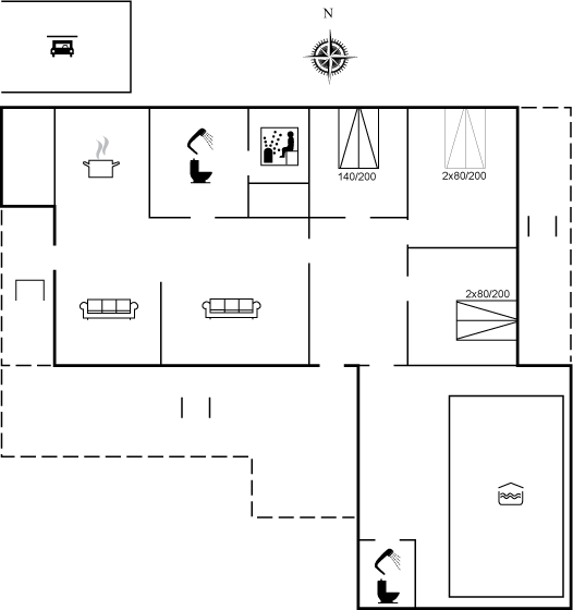 Dejligt stort poolområde med spa og adgang til sauna og 1 af husets badeværelser. Huset er beliggende på en naturgrund med legeborg, gynger og sandkasse. Huset har en god fliseterrasse, hvor man kan nyde solen og freden i området.
