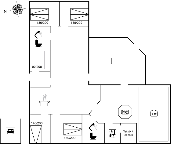 Pragtfuld swimmingpool-afdeling med swimmingpool (5,9 x 4,0 x 1,3 m), integreret spa til 4-5 pers. (standvand) og badeværelse med bruseniche og gulvvarme. Dejligt, ekstra badeværelse med bruseniche og gulvvarme. Husets sovepladser fordeler sig på 5 værelser; 4 med dobbeltseng og 1 med køjeseng.