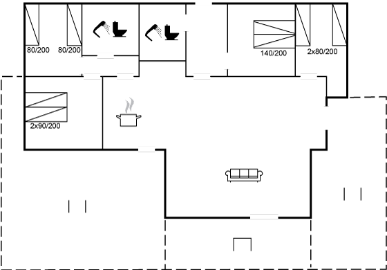 Fra alrummet er der direkte udgang til den 70 m² store, delvist overdækkede terrasse. Her kan I nyde solen dagen lang, samles omkring grillen om aftenen eller finde læ og skygge under overdækningen. På plænen er der god plads til boldspil og leg, og den udendørs bruser er skøn efter en tur i bølgerne.