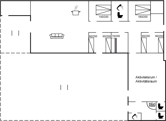 Aktivitetsrummet er husets naturlige samlingspunkt, hvor både store og små kan hygge sig i timevis med billard, poolbord og bordfodbold. Perfekt når vejret kalder på indendørs sjov.