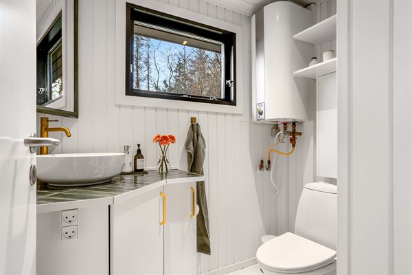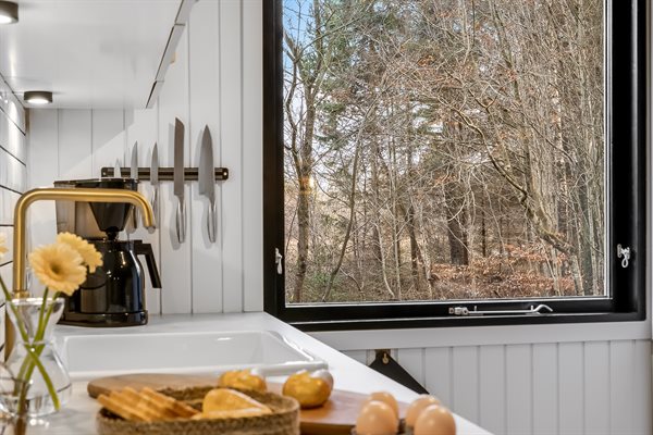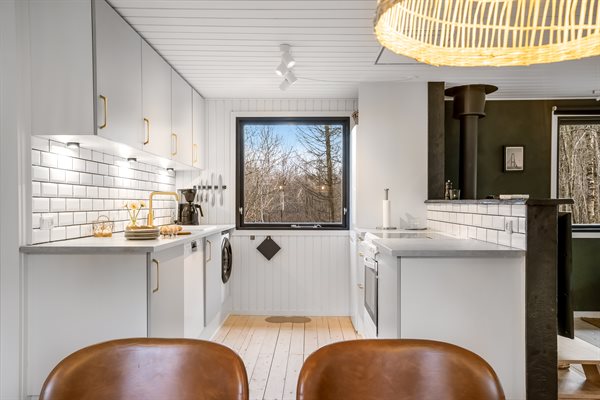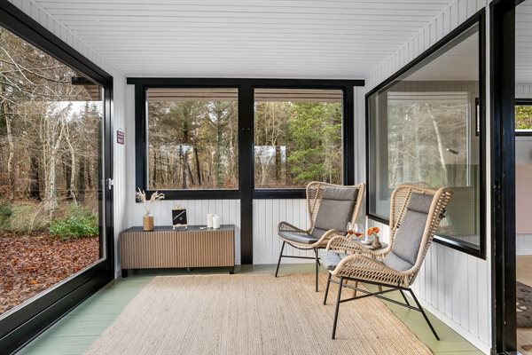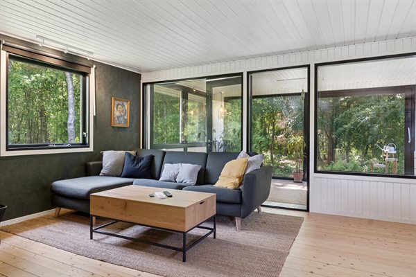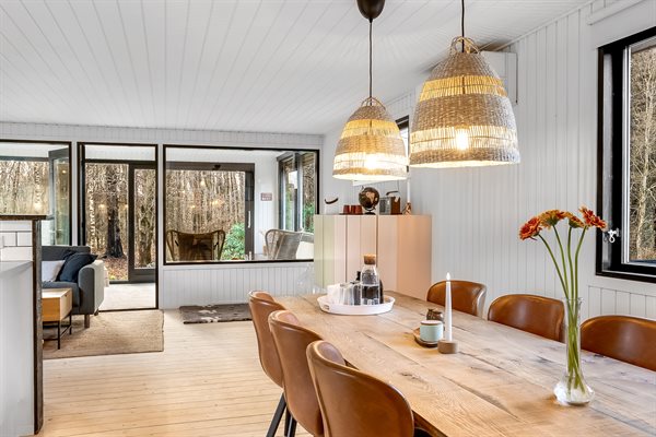 Indenfor sørger store panoramavinduer for, at man kan se ud i den skønne natur – hvilket skaber en helt særlig atmosfære.