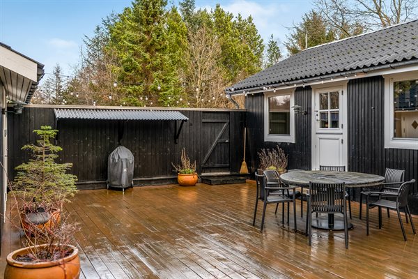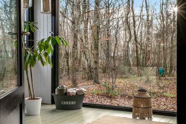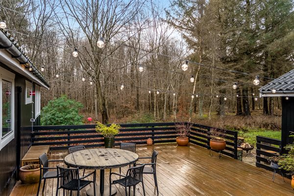 Den store, afskærmede terrasse inviterer til afslapning fra morgen til aften, og herfra har man den smukkeste udsigt til naturen. Dyrelivet er rigt – både harer, fasaner, egern og rådyr kigger ofte forbi, sammen med mange andre skovens gæster.