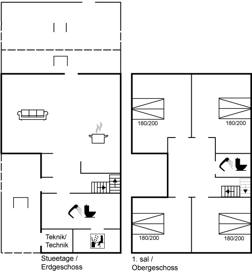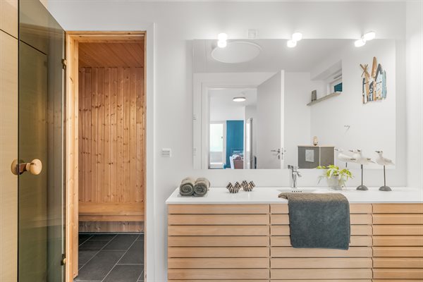 Sommerhuset byder desuden på ekstra forkælelse i form af en sauna i det ene badeværelse – perfekt efter en dag med strandliv, svømmeture eller lange gåture langs vandet.
