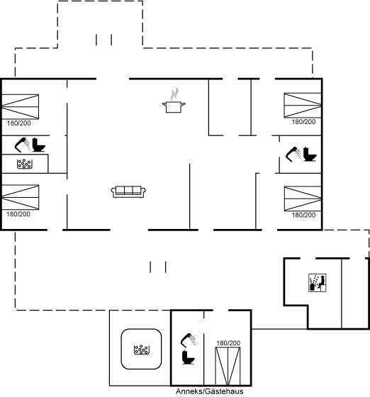 Sommerhuset fremstår perfekt fra ende til anden - med en rigtig god planløsning, hvorfor det er oplagt til f.eks. to eller sågar tre familier, som ønsker at holde en fælles ferie eller blot én familie, som har invitereret bedsteforældrene med på ferie. Huset har et fantastisk køkken/alrum, som er kombineret med opholdsstuen, hvor hele familien kan samles til indendørs hygge. Der findes desuden 3 flotte badeværelser.
