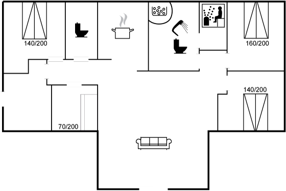Indvendig fremstår sommerhuset lyst og moderne med en god indretning, som passer rigtig fint til f.eks. en familie med børn, og der er mulighed for at invitere f.eks. bedsteforældrene med på ferie. Husets midtpunkt er det store flotte køkken-alrum, som er kombineret med opholdsstuen, hvor de store vinduespartier giver et virkelig godt lysindfald. Der er fra stuen direkte adgang til den skønne terrasse.