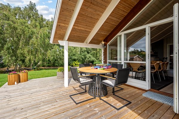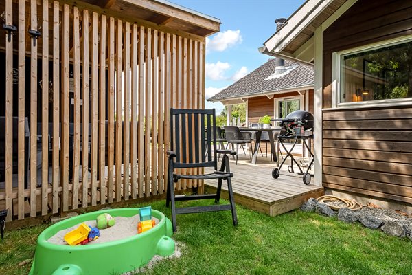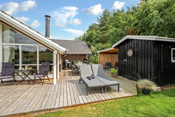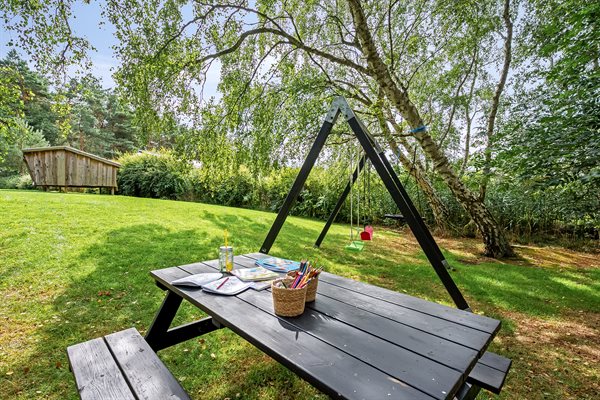 Her har hele familien alle muligheder for en dejlig ferie! Den skønne have lægger op til masse af leg for hele familien - hyg jer med overnatning i shelter, snobrød på bålstedet, eller hygge på den overdækkede terrasse. Dette veludstyrede, moderne og pænt møblerede feriehus, befinder sig nær Ebeltoft by i et roligt område, der er helt ideelt for børnefamilier. Det ligger i en behagelig gåafstand, som, via stisystemer, hurtig bringer jer frem til strand, bager og indkøb. Fra sommerhuset går en 10 km lang natursti ind igennem et stort naturområde bag Ebeltoft by, og her er der gode muligheder for cykel- og traveture.