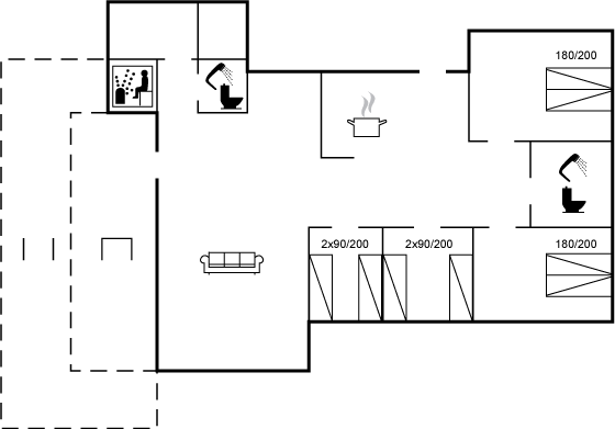 Huset er lyst og rummeligt med et stort opholdsrum, hvor køkken, spiseplads og stue går ud i ét. Her er der gode muligheder for at være sammen – hvad enten det handler om at lave mad, læse en bog eller bare slappe af. Børnene kan hygge sig med bøger og legetøj, mens de voksne nyder en stille stund i spabadet eller saunaen.