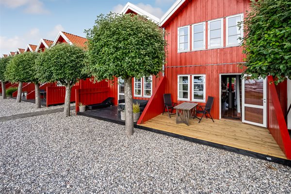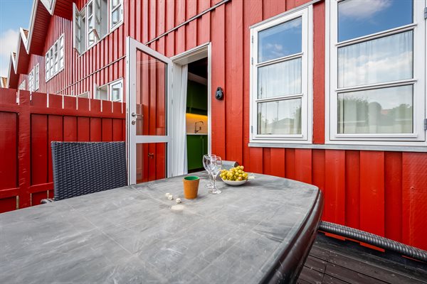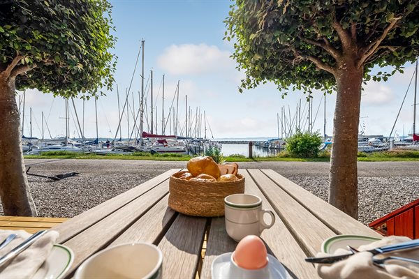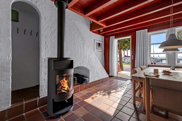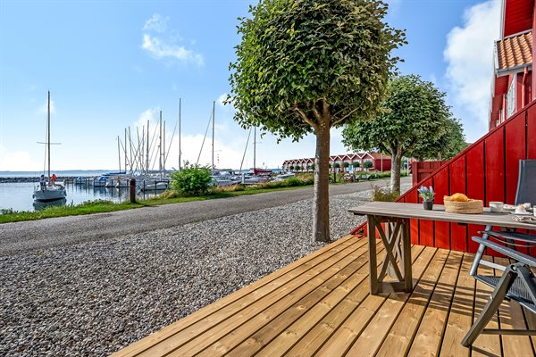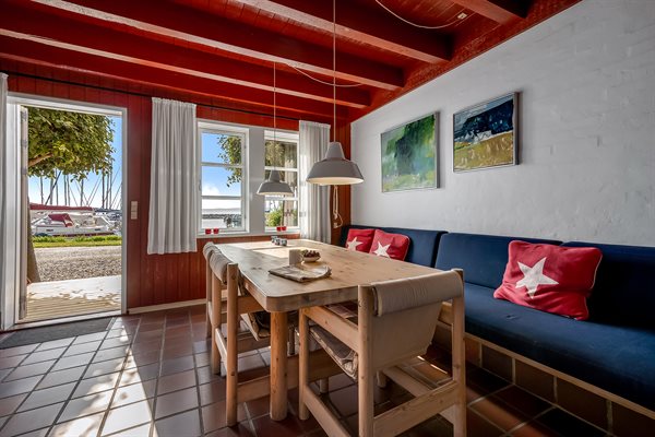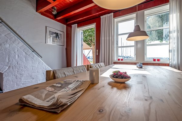 Det åbne køkken alrum i stuen leder ud til terrassen, hvor der bare er 15 meter til havet og hvor man kan nyde stemningen i lystbådehavnen.
