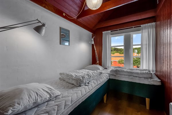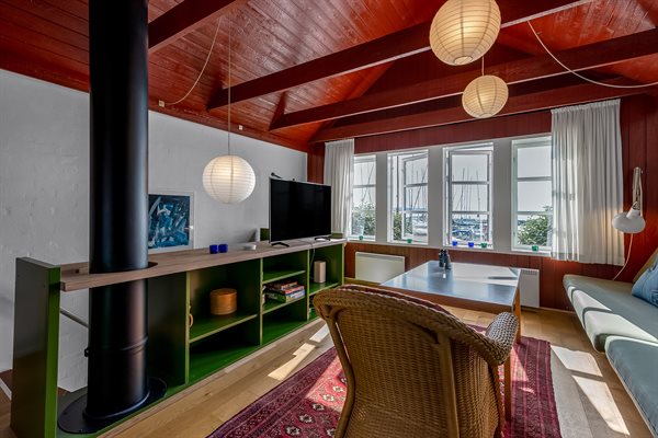 På førstesalen ligger de to soveværelser. Sovepladserne fordeler sig på to sovepladser i dobbeltseng, samt to sovepladser i enkeltsenge. På førstesalen er der ligeledes opholdsrum med sofa og tv og den skønneste udsigt over havnen og Vigen.