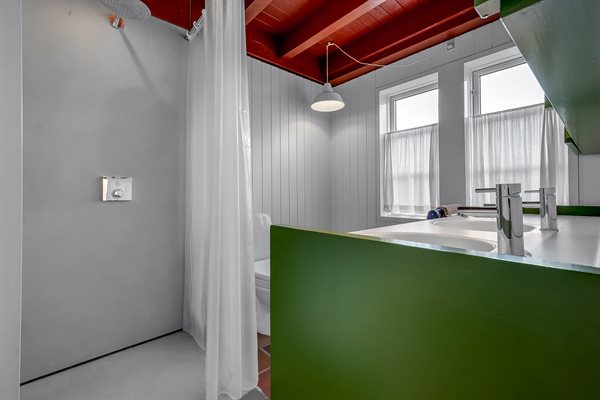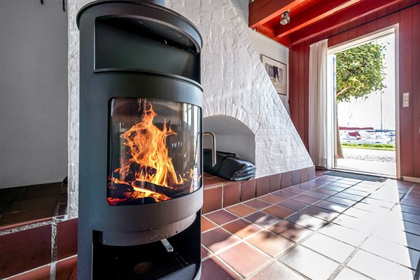I stuen findes også boligens badeværelse med bruseniche og toilet. Der er gulvvarme i hele stueetagen inklusive badeværelset og i de kølige måneder kan man tænde op i brændeovnen.