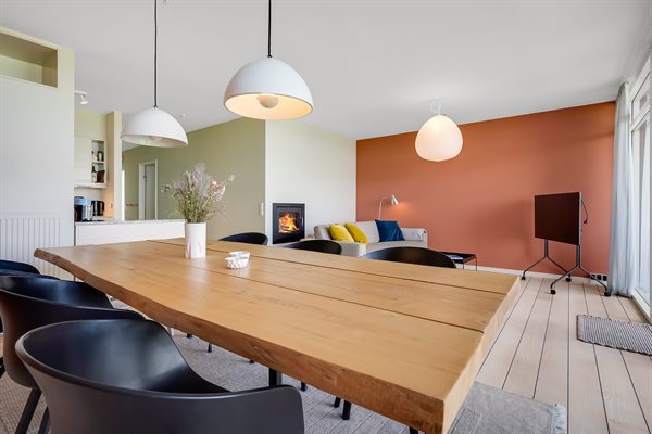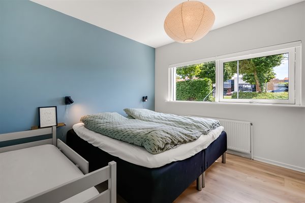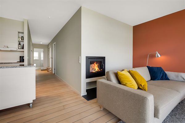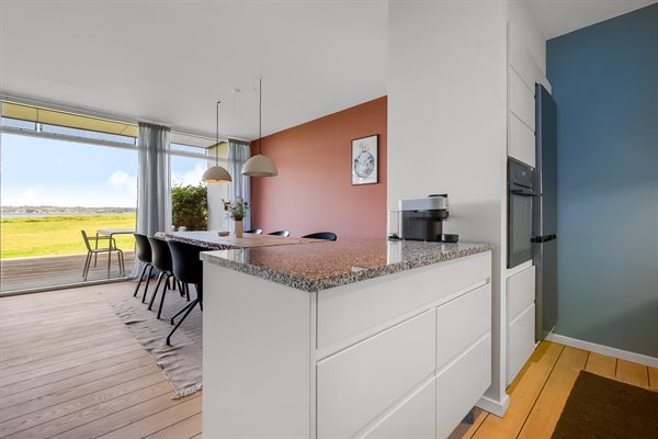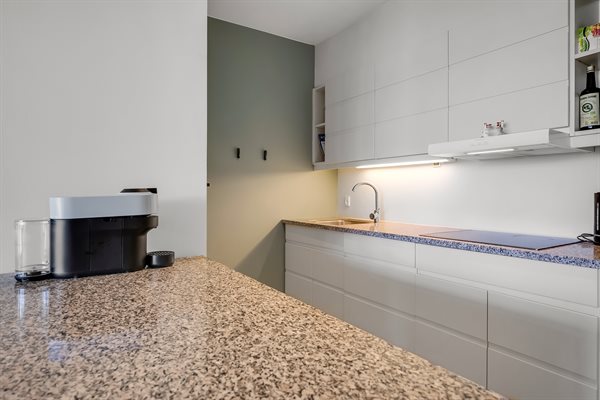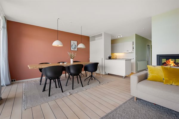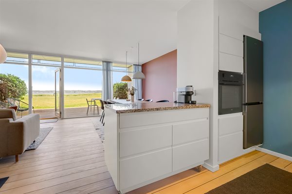Køkkenet ligger i åben forbindelse med stuen og er praktisk indrettet med bl.a. opvaskemaskine. Lejligheden rummer to gode soveværelser – det ene med dobbeltseng og en enkeltseng, det andet med en dobbeltseng. Derudover er der en god og komfortabel sovesofa i stuen, så der i alt er soveplads til op til syv gæster.