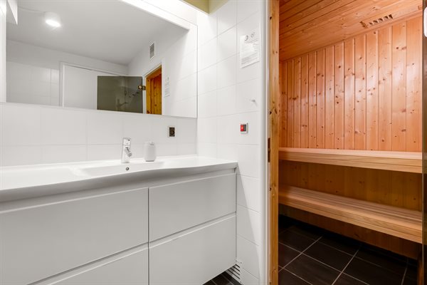 Toilet- og badefaciliteterne er opdelt i to separate rum: ét med spabad, bruseniche og adgang til sauna – og ét med toilet og håndvask.