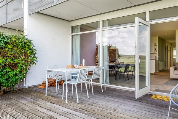 Velkommen til en lys og velholdt ferielejlighed med en helt unik beliggenhed – direkte ud til Ebeltoft Vig med fri udsigt over vandet. Fra entréen træder man ind i en indbydende stue med udgang til en overdækket terrasse, hvor man kan sidde i læ og nyde solnedgangen over bugten og Mols Bjerge i horisonten.