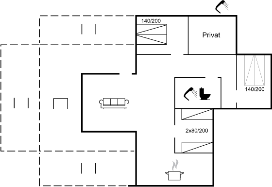 Huset har nyere køkken og badeværelse samt 3 rummelige værelser. Stort alrum med skøn udsigt over bugten - med direkte forbindelse til store træterrasse og haven med plads til boldspil og leg på trampolinen eller i sandkassen. Huset har det meste af året en udendørs bruser, så det er nemt at vaske sig ren for sand efter den korte tur til stranden og i bølgen blå.