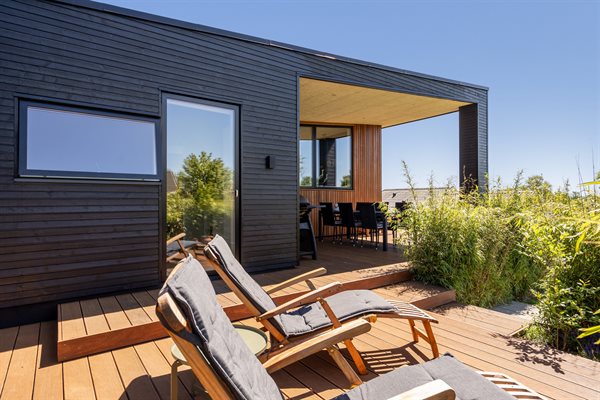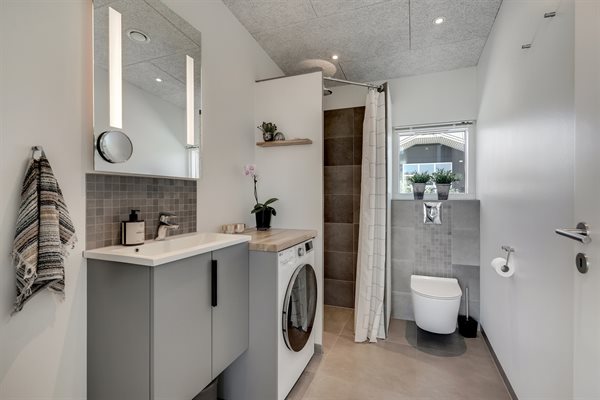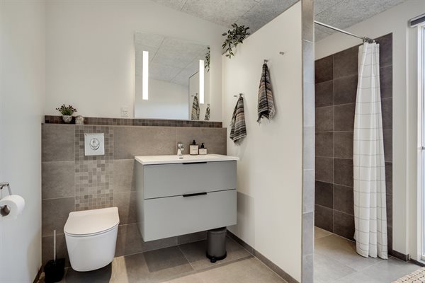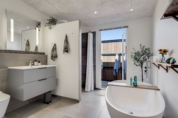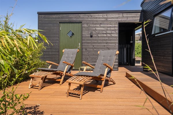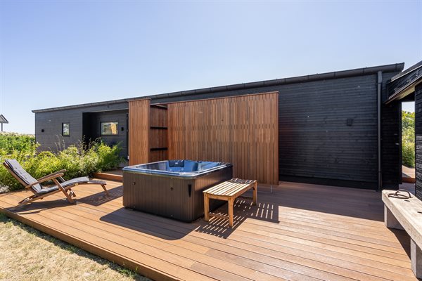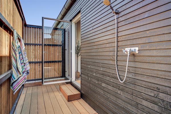 Husets udendørsarealer er også noget helt specielt - her findes et meget stort terrasseareal, hvor der bl.a. er to overdækkede områder. Det er således altid muligt at finde en plads i solen, et hjørne med læ og en plads i skyggen. Den smukke udsigt kan nydes fra næsten alle udendørs områder. Der findes også et skønt udendørs spabad, hvor du kan sidde og nyde det varme vand og stilheden. Lige ved siden af spaen er der etableret en stor udendørsbruser.