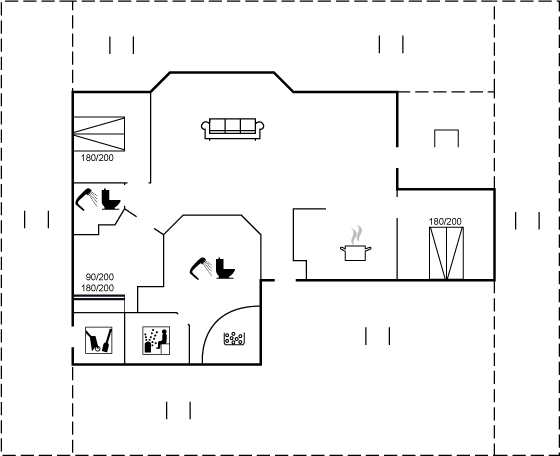 Huset har også 2 badeværelser begge med toilet, bruser og gulvvarme. I det store wellness-badeværelse er der desuden en spa med plads til 4 personer og adgang til en 3 personers sauna.