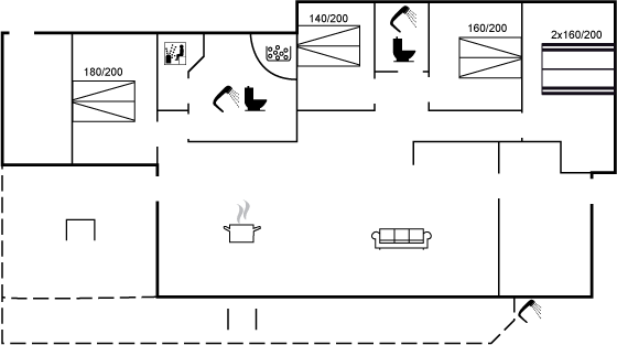 Sommerhuset råder over fire soveværelser, der alle er placeret i en forskudt afdeling i forhold til alrummet, hvilket giver en praktisk opdeling af opholds- og soveområder. Ét af værelserne har plads til fire personer, og som en ekstra detalje findes der et hyggeligt hemseområde med adgang fra det forskudte plan. Her kan børnene få deres helt egen hule, eller I kan benytte hemsen som ekstra soveplads. Efter en dag ved den børnevenlige strand i Binderup, som ligger i kort afstand, kan I forkæle jer selv med lidt wellness i husets spabad til to personer eller i saunaen, hvor afslapningen er i højsædet.