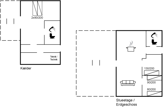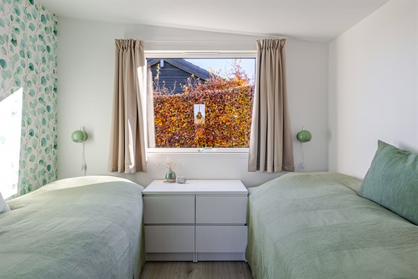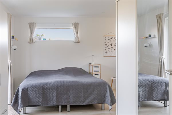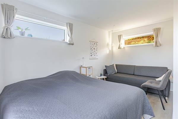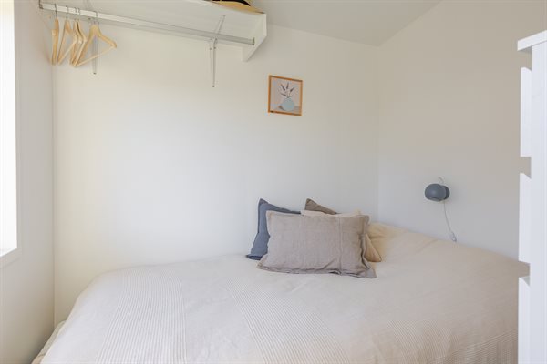 Sommerhuset rummer to soveværelser i stueplan og endnu et stort værelse på det nederste plan – ideelt til familien med små børn, da der er god plads til en barneseng. Fra dette værelse er der direkte adgang til endnu en hyggelig terrasse. Nederste plan nås nemt via et par trin ad trappen udenfor.