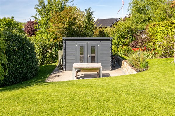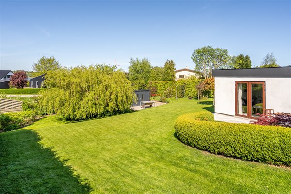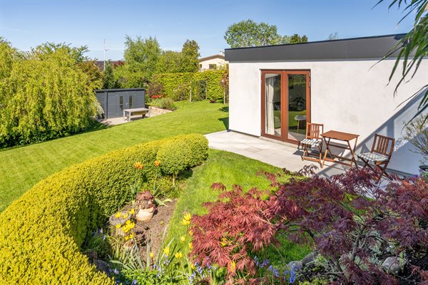 Den skønne have er et kapitel for sig. Her kan børnene lege under hængepilen, som danner en naturlig hule, mens de voksne slapper af i hængekøjen.