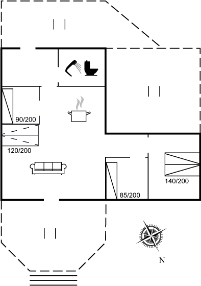 Bemærk, at to af de i alt seks sovepladser befinder sig på en sovesofa i stuen.