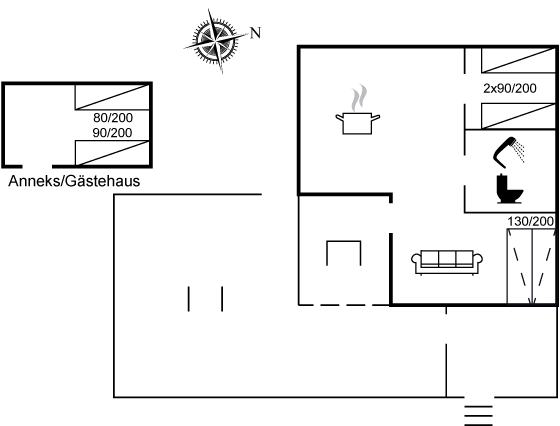 Der er i alt 6 sovepladser, som er fordelt på 2 soveværelser med hver 2 enkeltsenge. Det ene soveværelse er et anneks. Derudover 2 ekstra sovepladser i sovesofa (dobbelt) i opholdsstuen.