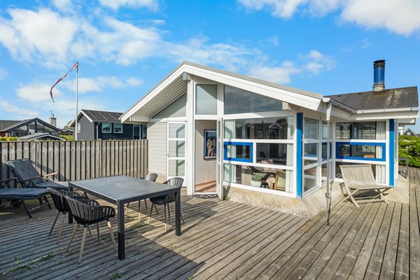 Her kan man gå direkte fra stuen ud på terrassen og videre ud på sandstranden. Dejligt terrasseareal omkring huset, hvor solen kan nydes hele dagen, og man om aftenen kan se solnedgangen.