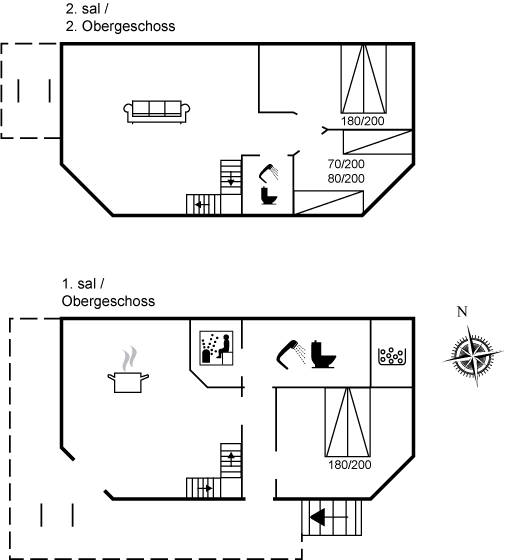 Bemærk at de to af sovepladserne er på hemsen, som man kommer til via stige i stuen på 2. sal.