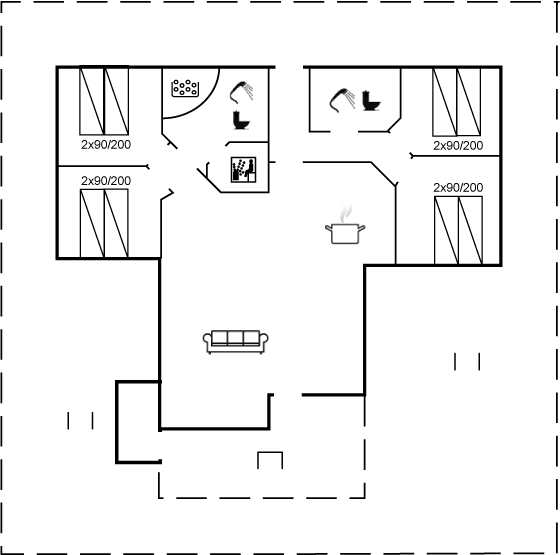 Huset er lyst og hyggeligt indrettet og har 4 regulære soveværelser og 2 badeværelser. Hjertet af huset er det store køkkenalrum, hvorfra der er udgang til stor delvist overdækket sydvest-vendt terrasse.