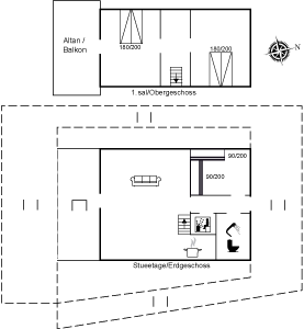 I stueplan er huset indrettet med bl.a. stort børneværelse med 2 store køjesenge (4 køjepladser), og på 1 salen findes der 2 store værelser, hvor der fra det ene værelse er udgang til en dejlig overdækket altan med loungemøbler.