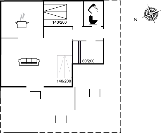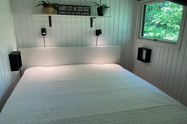 Bemærk, at to af de i alt seks sovepladser befinder sig på en sovesofa i stuen.