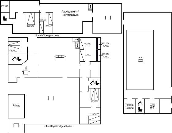 Ved siden af huset ligger den store svømmehal, hvor I bl.a. finder den store pool. Bemærk at poolen i den dybe ende er 2,5 meter dyb, hvorfor børn ikke må efterlades uden voksnes opsyn. Svømmehallen indeholder desuden sauna og badeværelse.