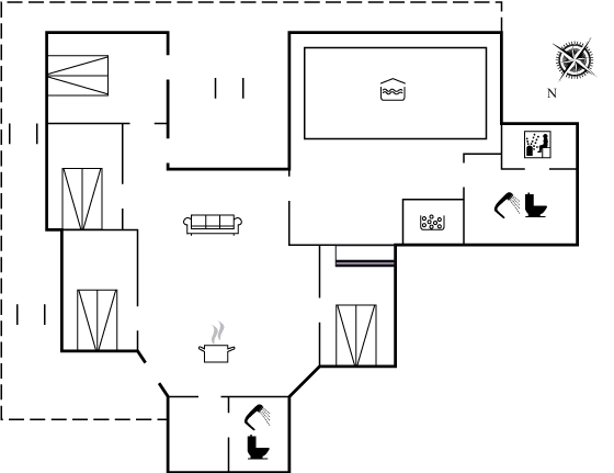 Udover køkken og stue indeholder huset 4 gode soveværelser, et ekstra badeværelse med bruseniche samt toilet og selvfølgelig en stor swimmingpool-afdeling, som indeholder både swimmingpool, spabad, sauna og et badeværelse med toilet, bruseniche og vaskesøjle.