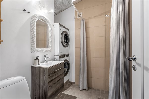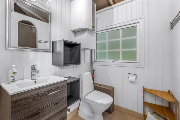 Der er to badeværelser med bruseniche og to toiletter. Der er gulvvarme på begge badeværelser. Sommerhuset og swimmingpoolen opvarmes med 2 energivenlige varmepumper.
