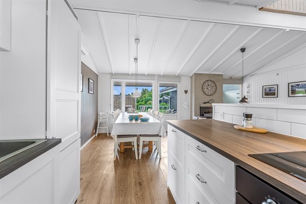 Det åbne køkken er veludstyret med bl.a. køle/frys, komfur med keramiske kogeplader og varmluftovn, emhætte, mikrobølgeovn, opvaskemaskine, kaffemaskine, elkoger m.v.