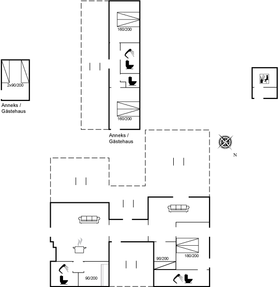 Sommerstedet består af hovedhus, hovedanneks, disponibelt anneks og et fritstående brændefyret sauna-hus med glasvæg mod stranden – perfekt til en dukkert i havet efterfulgt af varme og hygge.