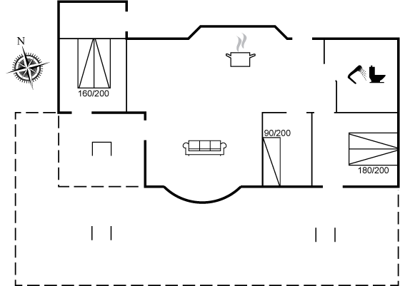 Køkken, spiseplads og stue er ud i ét og udgør sammen med det store sydvendte terrasseområde, de naturlige samlingssteder for hygge og afslapning med venner og familie. En del af terrassen er overdækket med mulighed for at finde skygge og nyde de lange lyse sommeraftener. Overalt i huset er der loft-til-kip og masser af lysindfald.