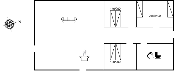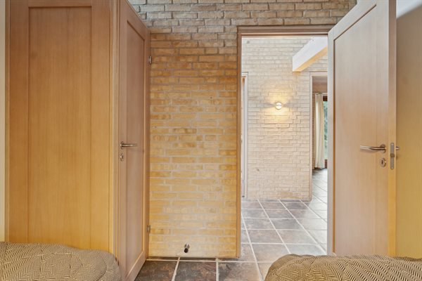 Der findes 3 soveværelser med hver 2 sovepladser og fra alle soveværelser er der udgang til haven. I de 2 af soveværelserne er der dobbeltsenge og i 1 af soveværelserne er der 2 enkeltsenge (måler 85x190 cm og er bedst egnede til børn og unge mennesker). Badeværelset er med bruseniche, gulvvarme og vaskemaskine.